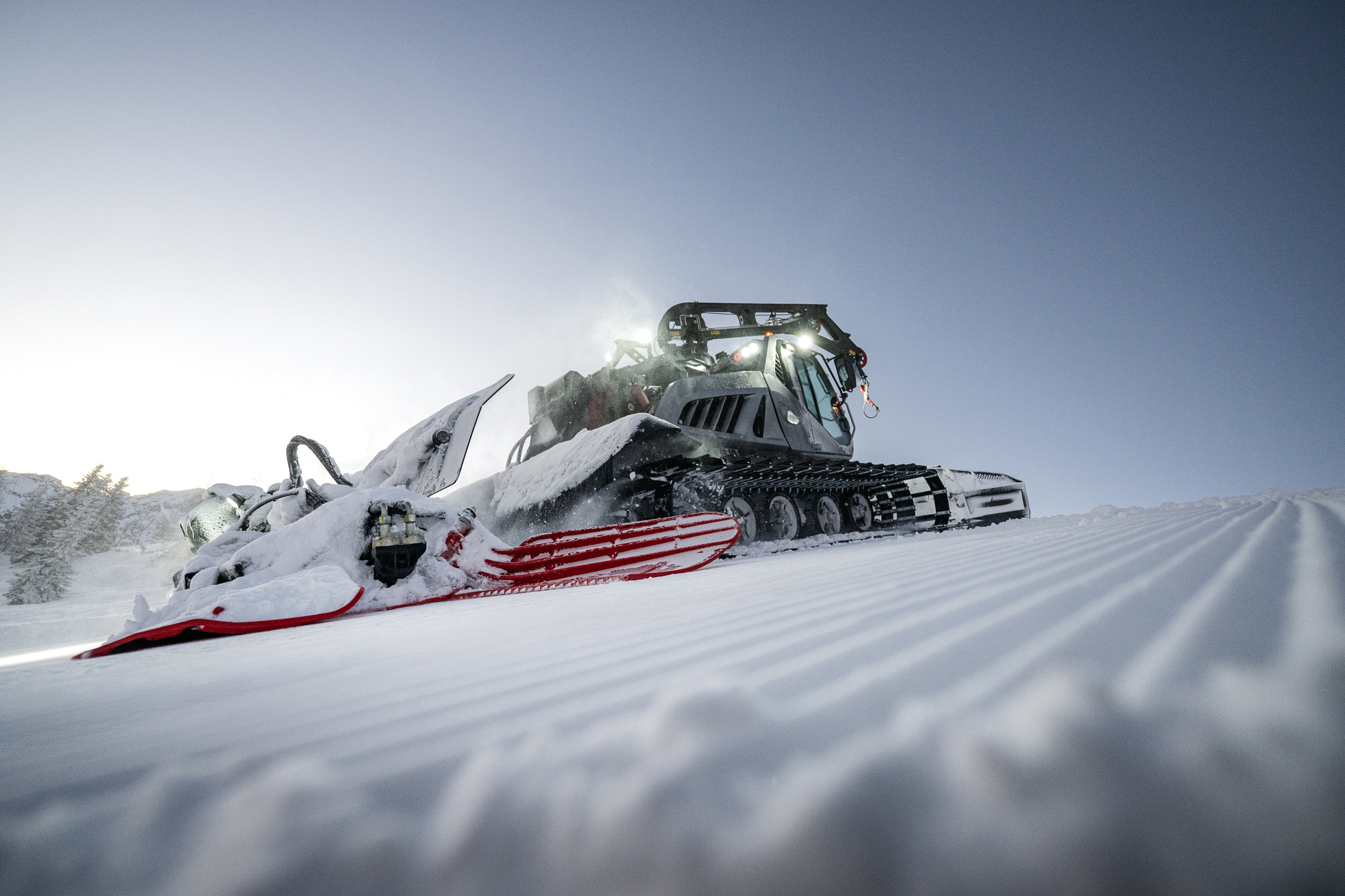 Prestazioni di spinta. Con una larghezza di 5.950 mm, la lama standard del Leitwolf è la più larga presente sul mercato mondiale. Un’ulteriore aspetto di notelvole importanza è l'angolo interno della lama, il cosiddetto raggio. Un raggio ottimale garantisce che la neve rotoli all'interno della lama e non fuoriesca dalla parte superiore o dai lati. Questo ha un grande impatto sulla quantità di neve che può essere spinta. Se il raggio non è ottimizzato, si verifica una fuoriuscita e, indipendentemente dalla larghezza o dall'altezza, la lama non spingerà la neve come potrebbe. Quindi, con una lama larga e un raggio ottimale è possibile spingere e preparare grandi volumi di neve in modo da ottenere superfici uniformi, ridurre il numero di passate e migliorare la consistenza della neve per consentire alla fresa di creare la perfetta finitura delle piste.
