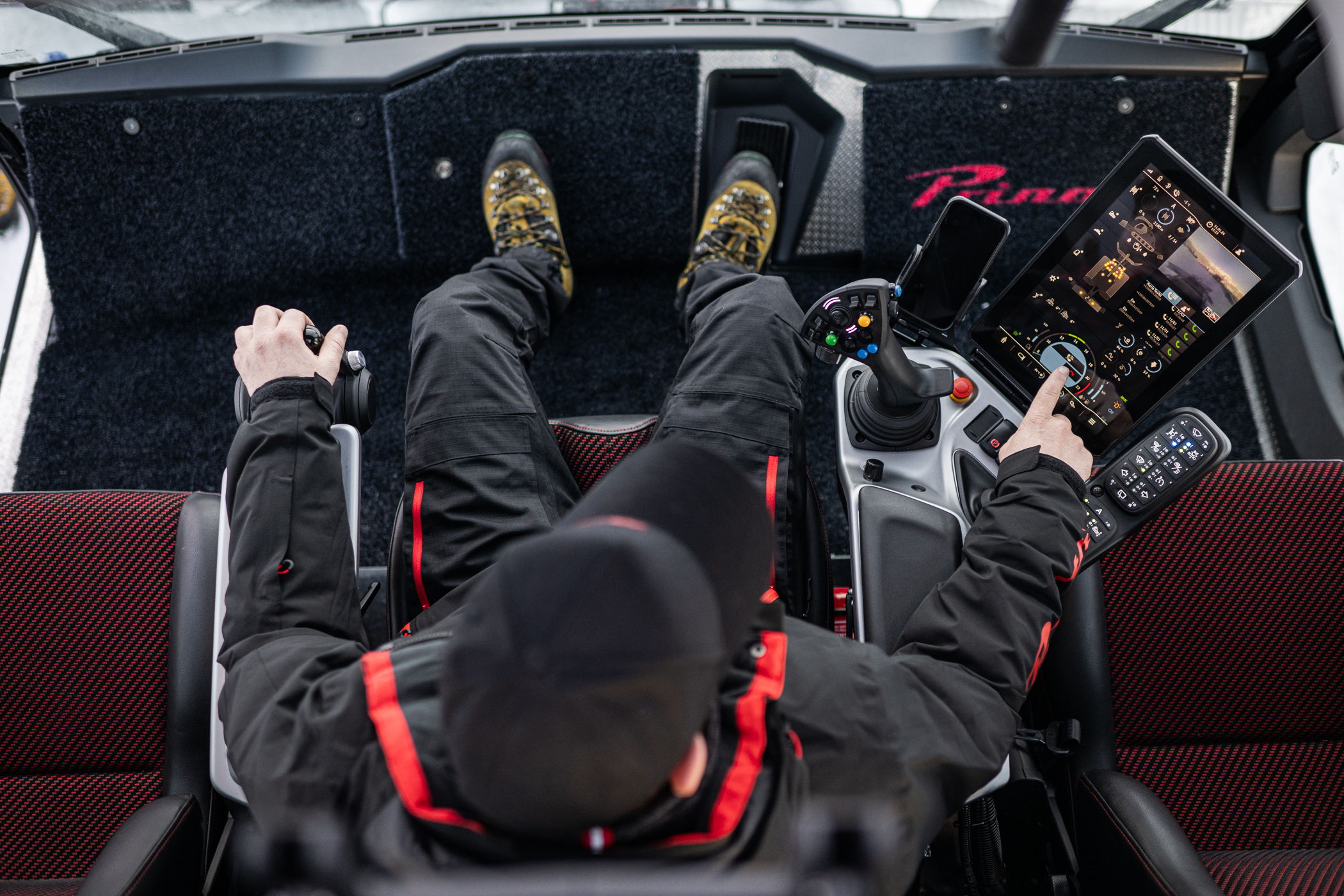 Comfort e facilità d'uso. Grazie al sedile centrale, unico nel suo genere, l'operatore ha la migliore visibilità a tutto tondo per avere la massima flessibilità quando si tratta di lavorare in prossimità di bordi e ostacoli o di costruire elementi di snowpark e funline. L'unità di controllo Prinoth è uguale per tutti i modelli Prinoth attuali. Questo fa sì che gli operatori sono in grado di manovrare facilmente tutti i battipista della gamma.